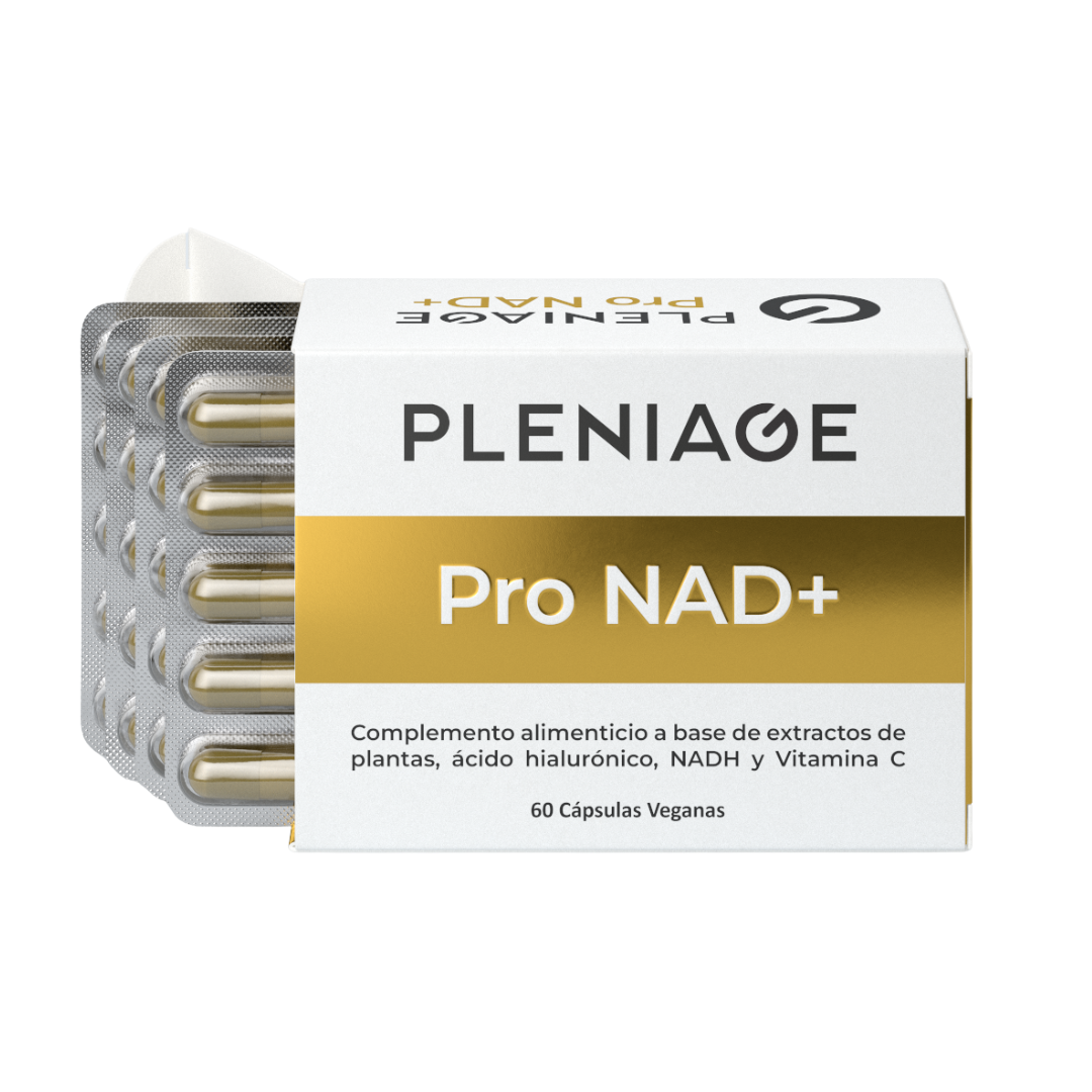 PLENIAGE® PRO NAD+ es un suplemento formulado para apoyar la producción de energía celular y los procesos de reparación que disminuyen con la edad. Su fórmula avanzada combina NADH (Beta-NAD reducido) con una tríada exclusiva de polifenoles bioactivos —Resveratrol (de Polygonum cuspidatum), Berberina y Quercetina— enriquecida con Ácido Hialurónico y Vitamina C, que contribuye a la protección de las células frente al daño oxidativo y al metabolismo energético normal.